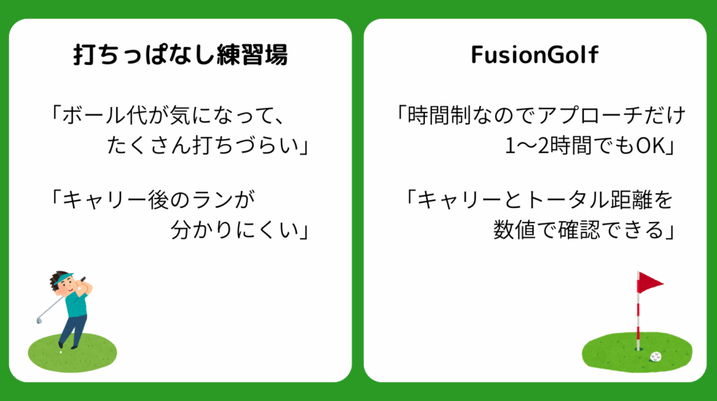 「打ちっぱなしだと、ボール代を考えるとアプローチだけを何十球も打つのは正直もったいなく感じる」